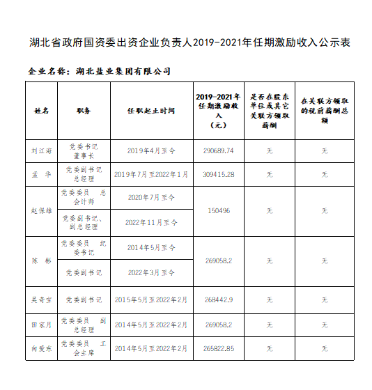 湖北省政府國資委出資企業(yè)負責(zé)人2019-2021年任期激勵收入公示表、湖北省政府國資委出資企業(yè)負責(zé)人2021年度薪酬公示表