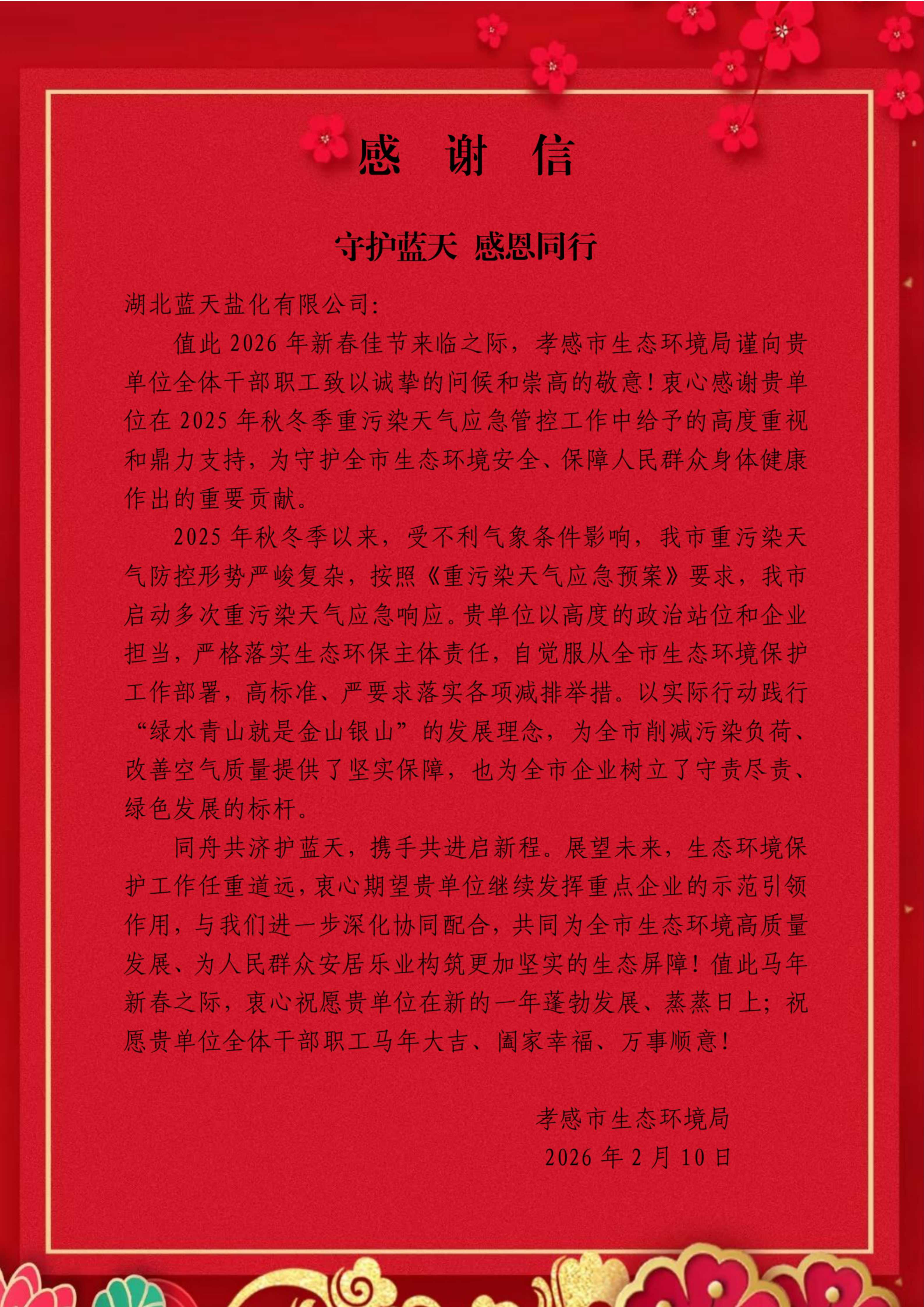 致湖北藍(lán)天鹽化有限公司的感謝信